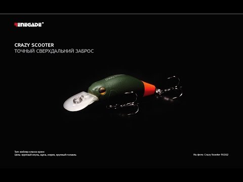 Воблер Renegade Crazy Scooter – плавающий воблер класса крэнк, основной специализацией которого является ловля крупного голавля, окуня, щуки и жереха. Размер воблера 52 мм, а вес, 8.2 г., что позволяет делать им точные и сверхдальние забросы. Рабочий горизонт приманки находится в диапазоне от 0.5 до 1.5 м. Приманка обладает стабильной игрой на течении любой силы и очень быстро достигает рабочей глубины. Все приманки оснащены качественной японской фурнитурой, а именно заводными кольцами Kashima и крючками Owner, что позволяет быть уверенным в том, что никаких неприятных неожиданностей не произойдет даже во время борьбы с самыми выдающимися трофеями. Воблер Renegade Crazy Scooter эффективен в любых водоемах и очень прост в освоении, поэтому его можно уверенно рекомендовать даже новичкам, а разнообразие цветовой гаммы удовлетворит потребности даже самых требовательных спиннингистов. Для ловли на эти приманки рекомендуется использование удилища класса лайт с тестовым диапазоном до 10-15 грамм, безынерционные катушки и плетеные лески.